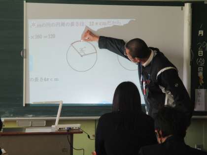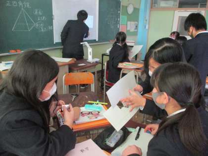 学び合いのダイアモンド型の机配置で生徒同士の関わり。