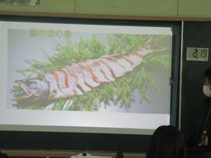 2年家庭科 サケの切り身の映像に驚きの声が。