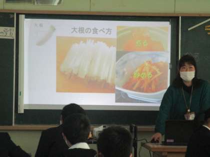 1年家庭科 食べ物クイズで頭と胃袋を刺激しながら学んでいました。