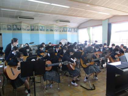 2年音楽 ギター一人一台だと基礎的な練習でも迫力があります。