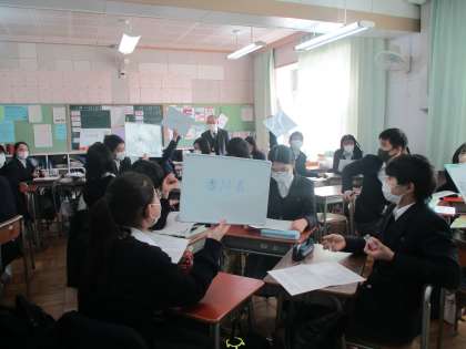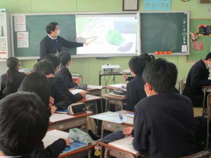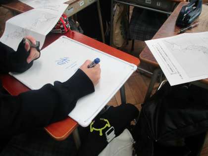 3年社会 県名クイズ「学び合い」×「ICT」×「各班のホワイトボード」、さすが三年生、正解続出で大盛り上がり、楽しく入試対策。「ホワイトボード」が一人一台又は班1台の端末になるとさらに面白いことになりそうです。