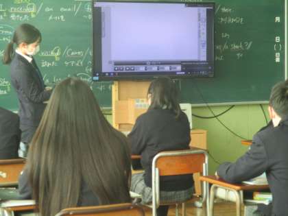 プロジェクターやTVモニターの使用が日常化、授業の雰囲気が変わってきて教室をまわるのが楽しいです。デジタル教科書で単語練習、ミラキャストを使ったクールでスマートな授業があったり、ICT設置や操作を手伝ってくれる生徒の姿があったり。