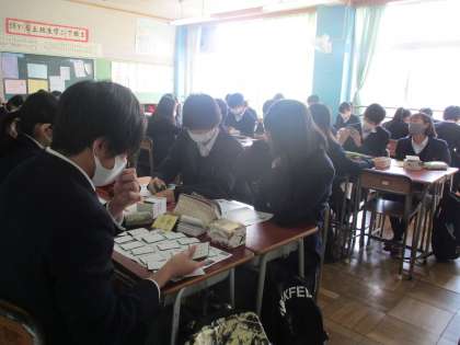 2年国語 皆大好き、百人一首の札の確認。今年度は百人一首セットを学運協の松村さんがたくさん用意してくれました。