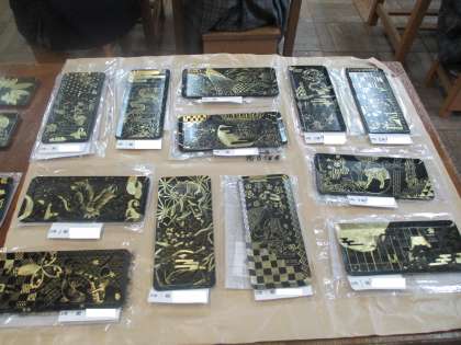 3年美術 日本的なデザインが、ニスを塗ることでさらに渋く輝いてきました。学習発表会、お楽しみに。