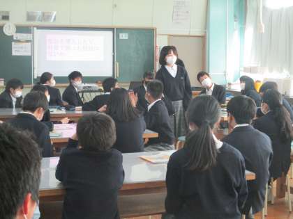 家庭科 「食品を購入したり、外食で困った経験はないか」班で話したことを学級全体に報告。発表者のほうに顔を向けて「うん。あるある」とうなずく優しいクラスでした。