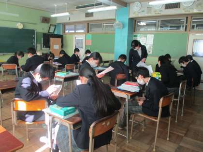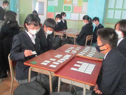 国語 学運協の松村さん、いただいた百人一首を使って、生徒が楽しく学習していますよ!このクラスも愛嬌のある素敵な学級でした。