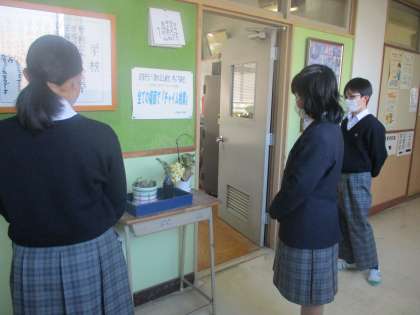 校長室前に1年生がきれいな花を飾りに来てくれました。有難うございます。