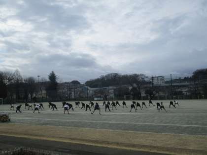 2年体育 サッカーの前の準備体操、涼しくてさわやかな校庭です。