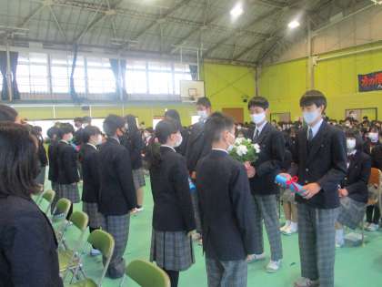 上級生から1年生へ歓迎の花やメッセージを渡しました。