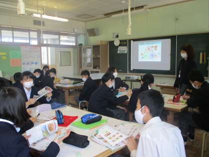 2年家庭科 成長期に必要な栄養を班で話し合いました。
