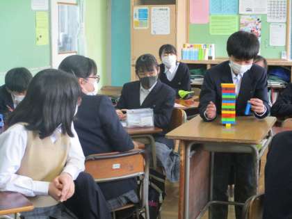 2年 作業をしながら、ジェンガで大盛り上がり。
