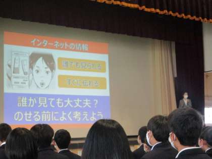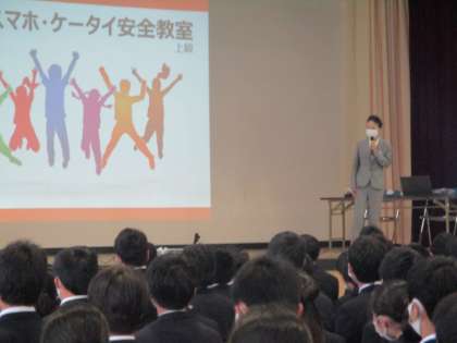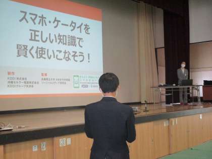 KDDIの方を講師に招いてスマホ・ケータイ安全教室を行い、ネット上の言葉の暴力、ゲーム依存、ネットに潜む悪意のある人の存在について学びました。