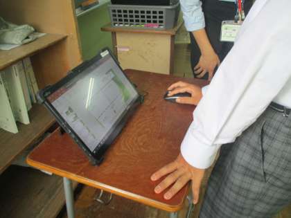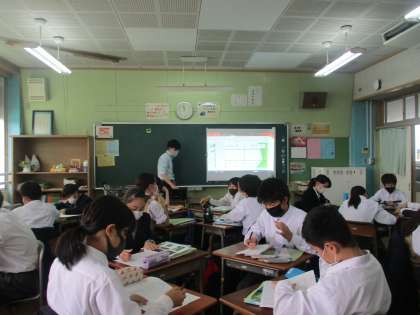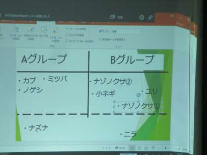 1年理科 「被子植物の分類」 班で考え、タブレットPCを使ってパワポでクラス全体に共有、先生のICT活用の工夫が見られます。生徒の皆さんも柔軟に対応できました。