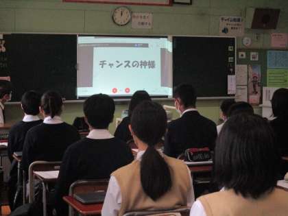 3年生はWEBで学年集会、スライドも使いながら各教室で話を聴きました。