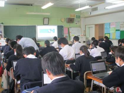 そのあとは一人一台のタブレットPCを使って修学旅行に向けた調べ学習。