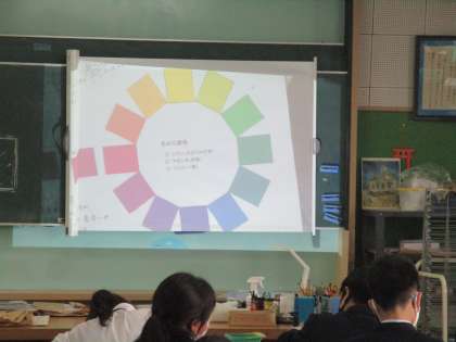 1年美術 色を混ぜてお手本に負けないくらいきれいに仕上げようと頑張っていました。