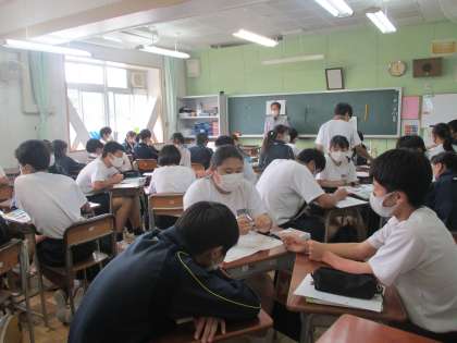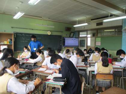 2年英語 昼食前もよく取り組んでいます。2年生はどのクラスも「いつでも どこでも だれとでも」関わるために大切な要素の一つ、愛嬌があるので感心します。