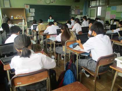 1年総合 「八王子調べ」。各自、充電保管庫からPCを取り出してサクサクと。