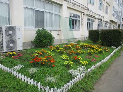 園芸部とPTAの方による花壇の花がぐんぐん成長。中学生と一緒で成長が早いです。