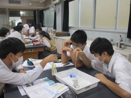 3年理科 夏らしい一見さわやかな青色と黄色の液体・・・実験中。