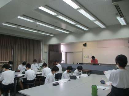 1年保健体育 冷房がいちばん利くアクティブ・ラーニングルームでキリっと学習。惜しいのがカーテン・・・。事務室の方がさわやかになるようカーテン屋(?)さんと調整くださっているところです。