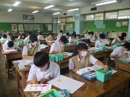 1年美術 黙々とレタリング、素晴らしい集中力です。