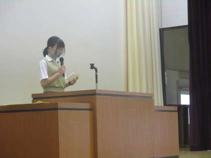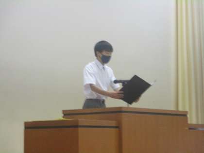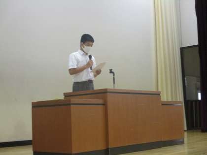 自分たちの学校をよりよくするための工夫を生徒会長、図書委員長、2年学年委員長からお話がありました。