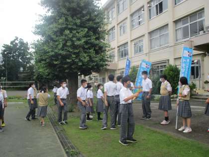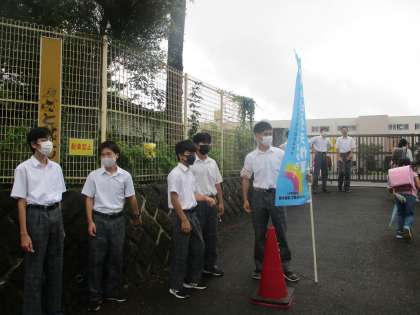 雨上がりの朝、生徒会によるあいさつ運動にたくさん参加してくれました。