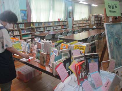 図書館 司書の先生が読書好きになるような工夫をしてくれています。今年度は図書委員の皆さんが毎日、開館してくれています。