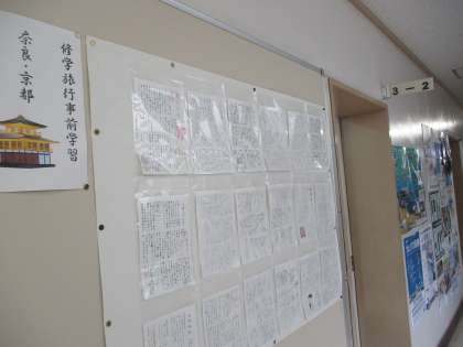 3年廊下 修学旅行の調べ学習掲示物とたくさんの上級学校のポスター掲示。そんな時期になりました。