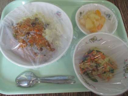【左写真】給食はドライカレー、サラダ、フルーツです。いい匂いが見本から廊下に。