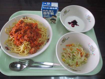給食委員が給食室前の見本を見て目に焼き付けて各教室で配膳開始です。今日はスパゲティミートソース、野菜サラダ、里山フルーツソース入りヨーグルト、牛乳です。
