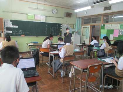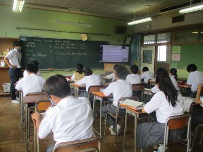 日本語学級 他校からの通級生も頑張っています。過去形等の文法説明は英語と日本語で。英語は世界で使える便利な言葉ですね。