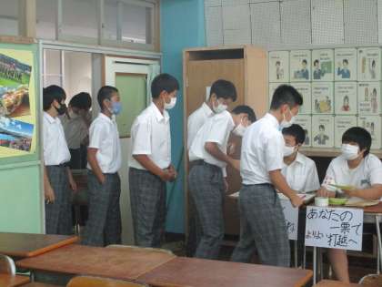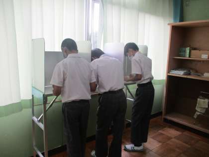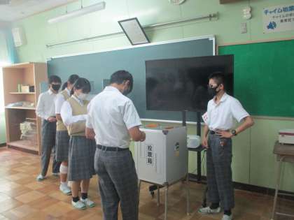 本物の投票箱等を使っていよいよ投票です。選挙管理委員の指示のもと、よい緊張感の中で投票箱へ清き1票。