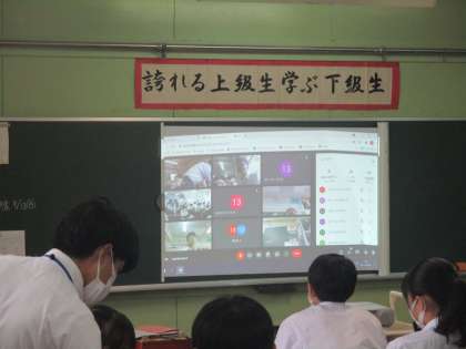 3年学活 みんなでGoogle Meet。得意な生徒が戸惑っている人に教える姿もあり楽しそうでした。