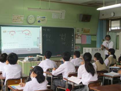 1年数学 デジタル教科書(帝京大学教育共同研究「数学×学び合い×ICT」)の登場です。生徒の皆さん、上級生に負けず素敵なあいさつ(笑顔、目礼)も立派でした。