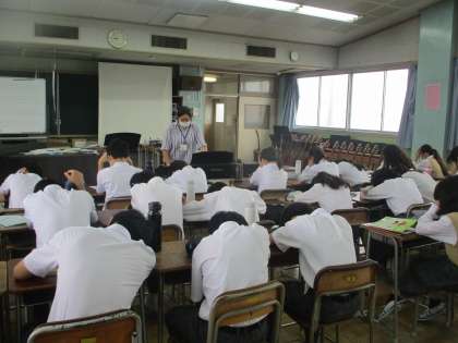 1年音楽 昼寝ではなく、顔を伏せて音を当てています。