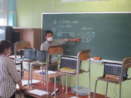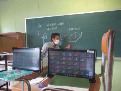 3年数学は学年の先生が役割分担。授業者、配信者、生徒役・・・。