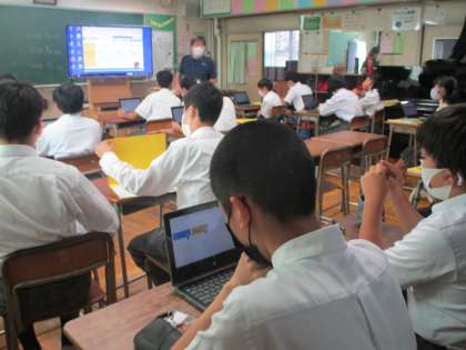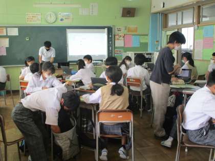6組は一人一台のタブレットPCを使って課題をWEB上に提出、3年技術はALルームでロボット作り、1年理科は班で一台のPCタブレット・・・先生と生徒の皆さんでGIGAスクールを推進中。