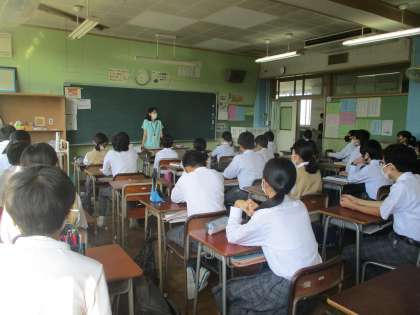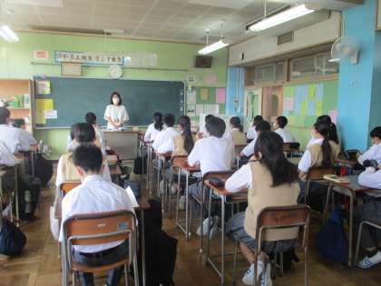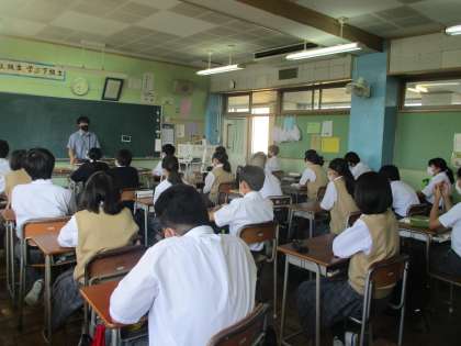 朝学活、少し眠そうですがしっかり話を聴いている1年生。今年から6組の生徒も副籍交流で一緒に学活と朝読書を行っています。