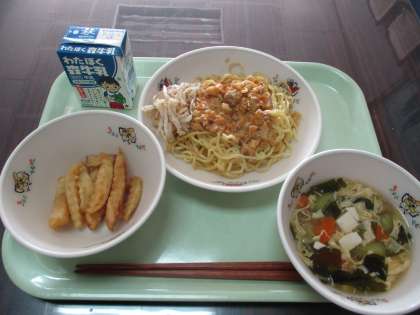 今日の給食は、ジャージャー麺、チンゲンサイと卵のスープ、フレンチポテト、牛乳です。