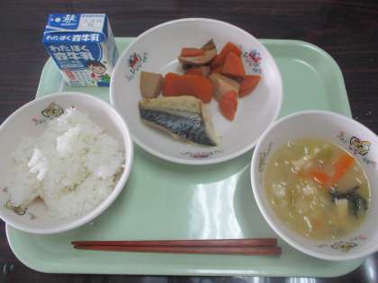 さばの塩焼き、里芋のころ煮、呉汁、ごはん、牛乳のおいしい和食です。