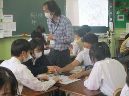 自分の体でイメージしながら「学び合い×ICT」。話し合いも上手、自発的な挙手も多い生徒の皆さんでした。