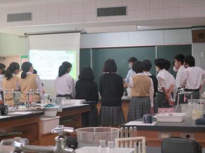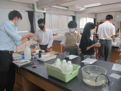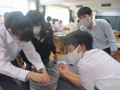 1年理科 今までは塩や砂糖など触れても大丈夫だったものが、少しずつ扱いに注意がいるものになってきました。慎重に水上置換の実験を仲間と協力して実施していました。