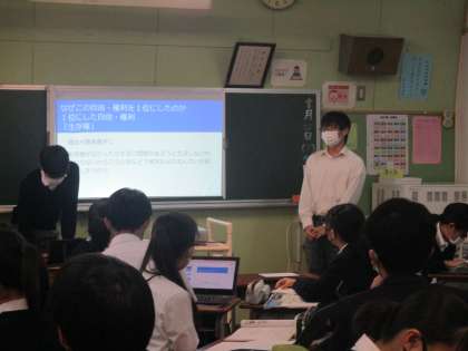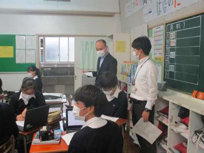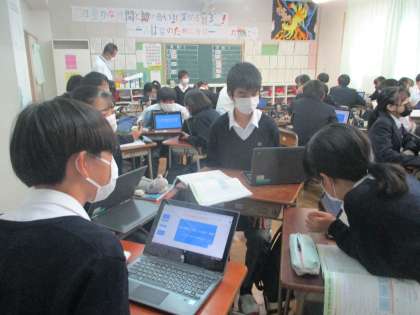 話し合いもタブレットPC操作もさすが3年生。まずは個人で、そしてサクサクとパワーポイントを班で作って、代表者が全体にプレゼンテーション。3年生の他の先生たちも参観しました。