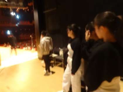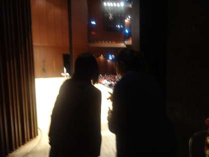 舞台袖でずっと見守る実行委員と笠舛先生。