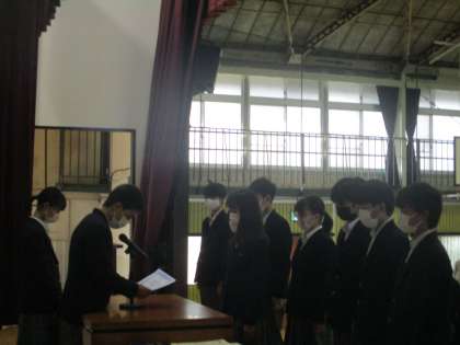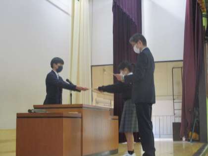 生徒会長から各委員長への委嘱式、前期会長からの「うっちゅ〜川柳」で2年生と星野先生(2枚も!)に表彰状が渡されました。