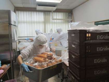 給食室 大量のパンが運ばれてきました。9月から温かいものが食べられるようになったのがうれしいですね。