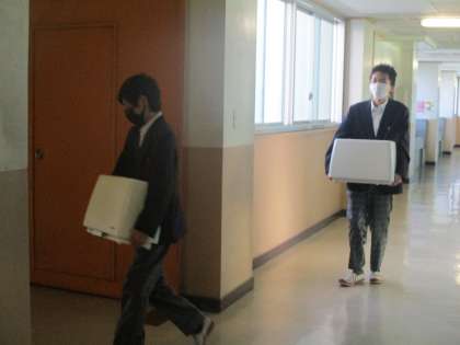 6組家庭科 重いミシンを運ぶ姿が頼もしい3年生。