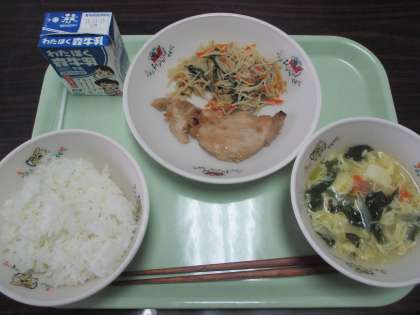 鶏肉の香味焼き、ビーフン炒め、豆腐のスープ、ごはんのおいしい和食です。寒い日には特に給食の温かさが身に沁みます。